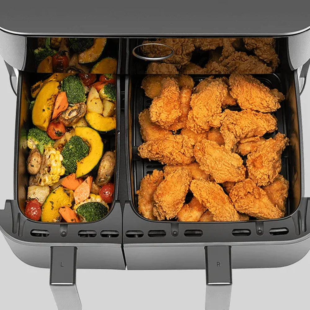 ظرفیت بالا ۱۰ لیتر: این هواپز از دو بخش مجزا تشکیل شده است؛ یک محفظه ۳.۵ لیتری و یک محفظه ۶.۵ لیتری که به شما اجازه میدهد همزمان دو نوع غذای متفاوت را بپزید.